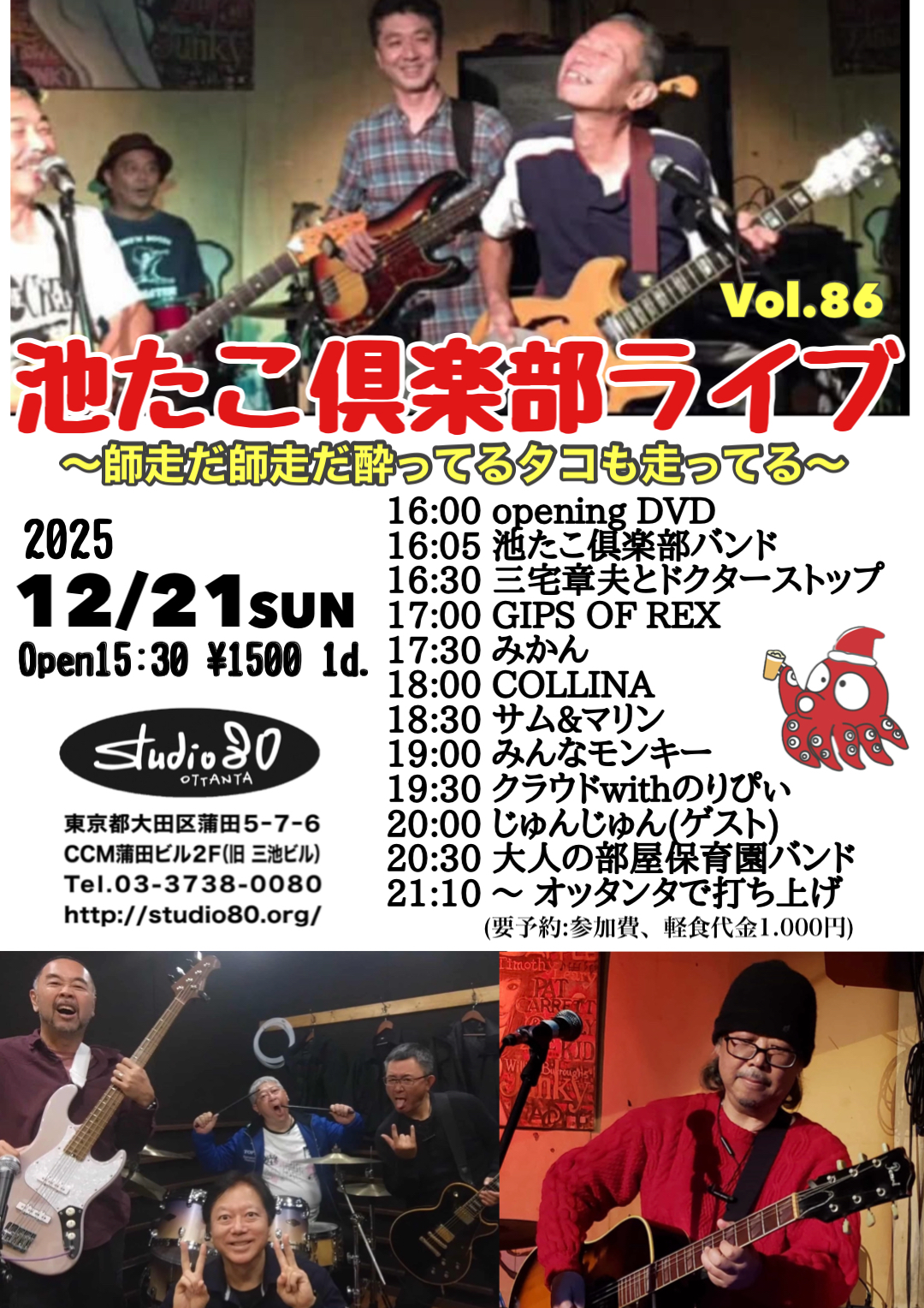 師走だ酔ってるタコも走ってる! 出演:池たこ倶楽部バンド、COLLINA 三宅章夫とドクターストップ、GIPS OF REX クラウド、サム&マリン、みかん じゅんじゅん、みんなモンキー、大人の部屋保育園バンド ¥1500 1d. Open15:30 Start16:00