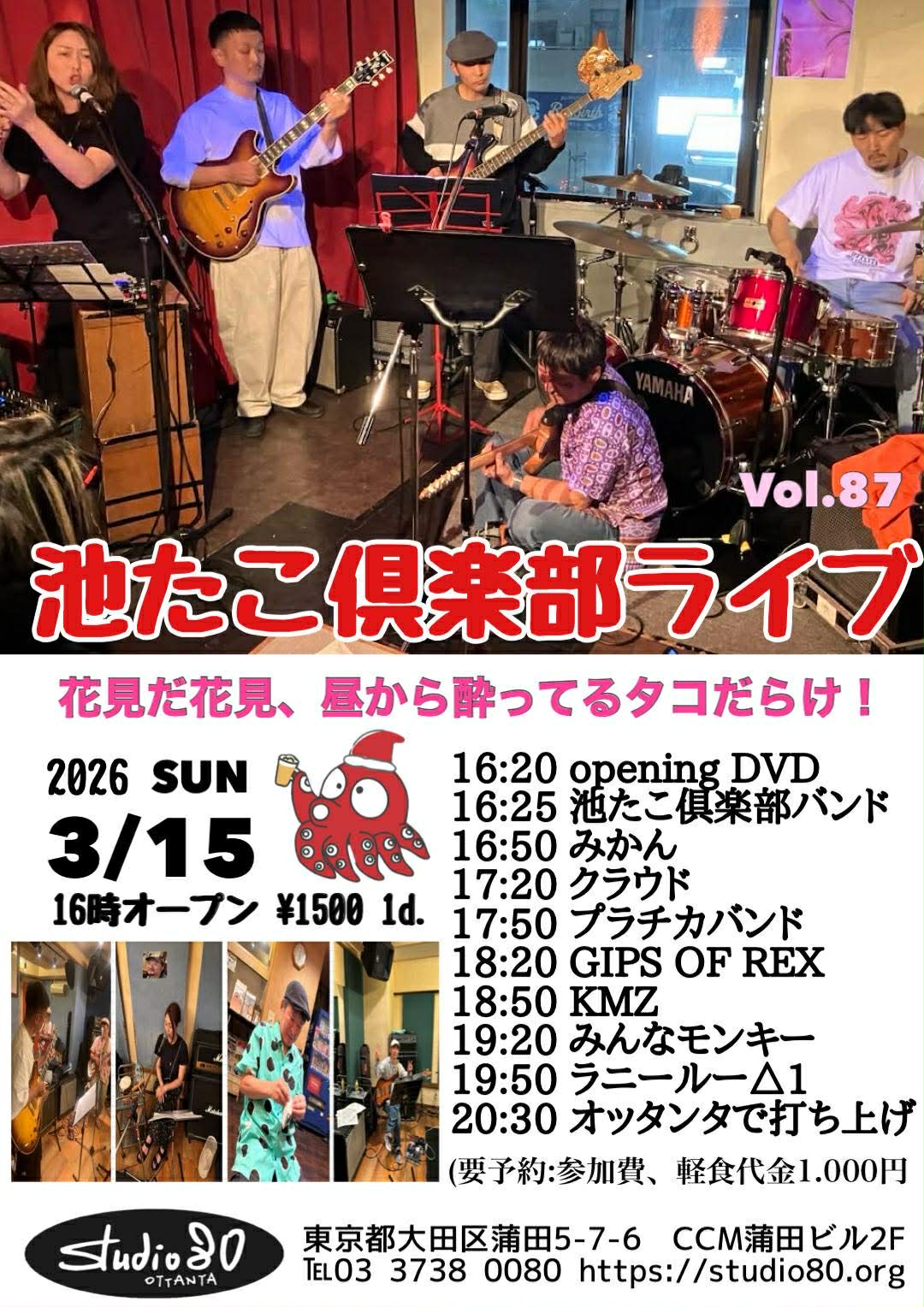 花見だ花見🌸昼から酔ってるタコだらけ! 出演:池たこ倶楽部バンド、KMZ、みかん みんなモンキー、GIPS OF REX、プラチカバンド クラウド、ラニールー△1 ¥1500 1d. Open16:00 Start16:20